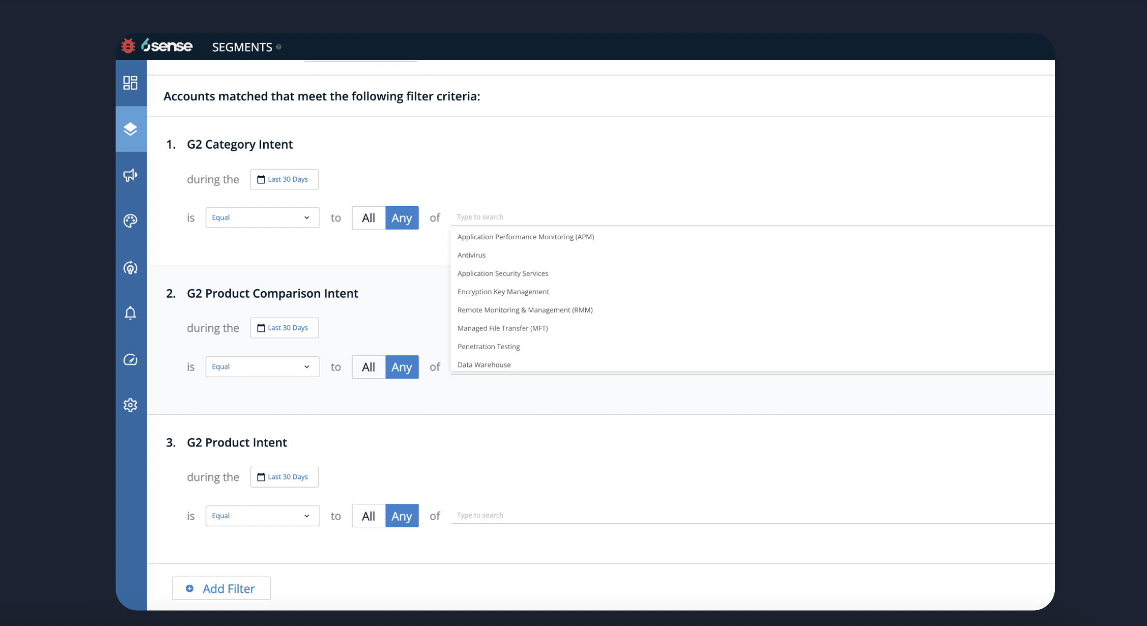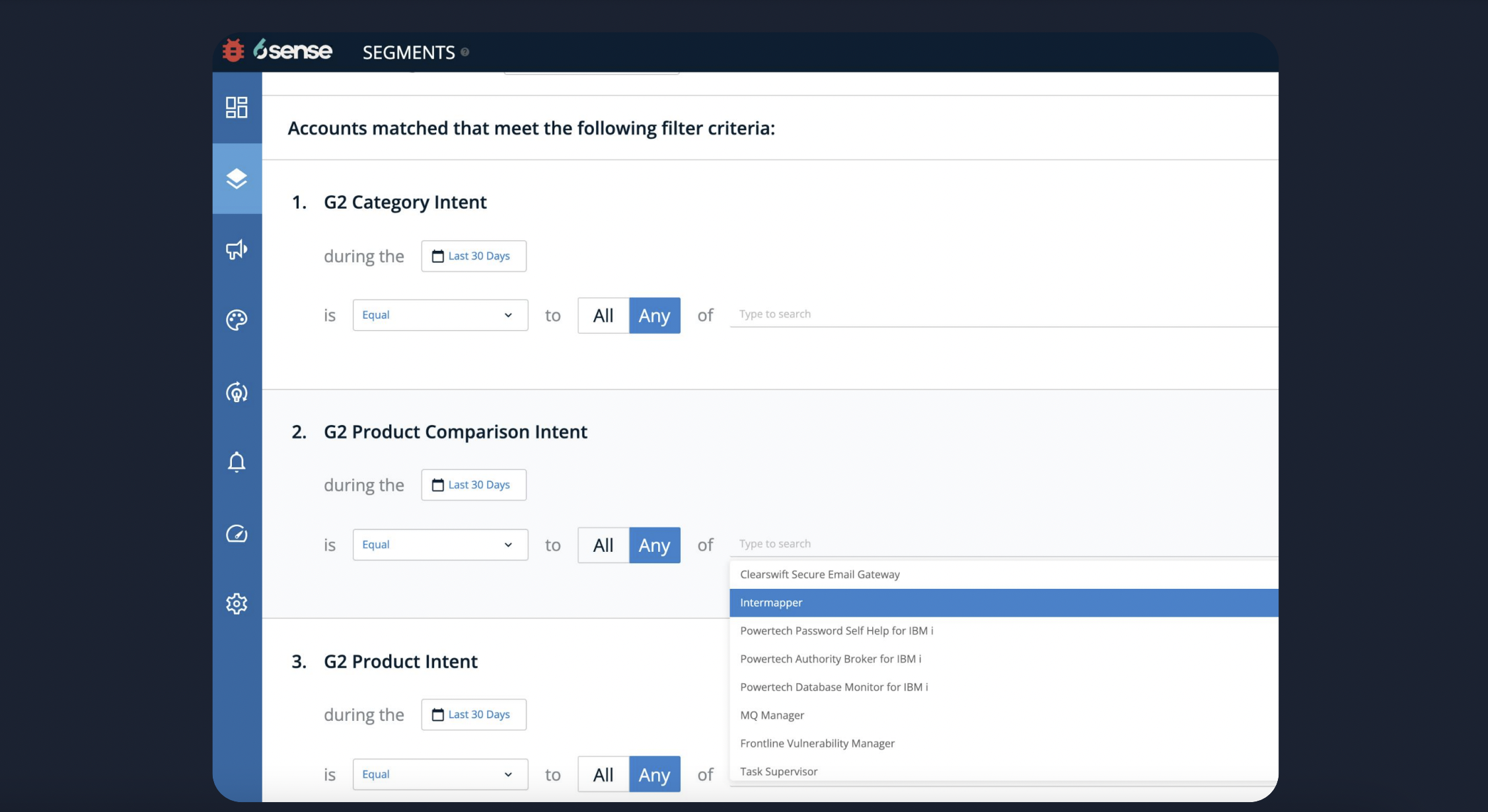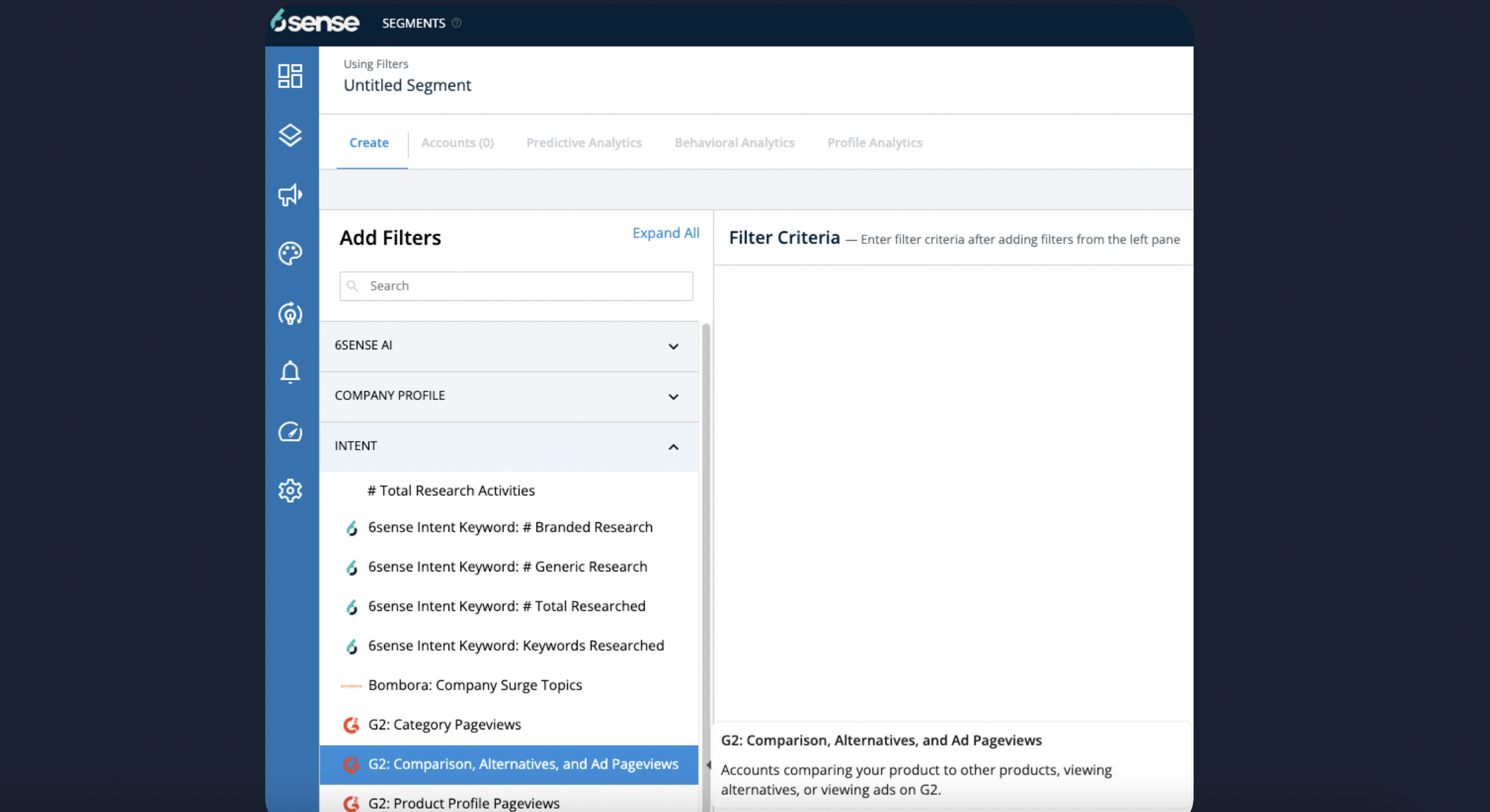 - The integration powers account fit scores and then target segments, based on G2 Intent signals and 6sense AI models.