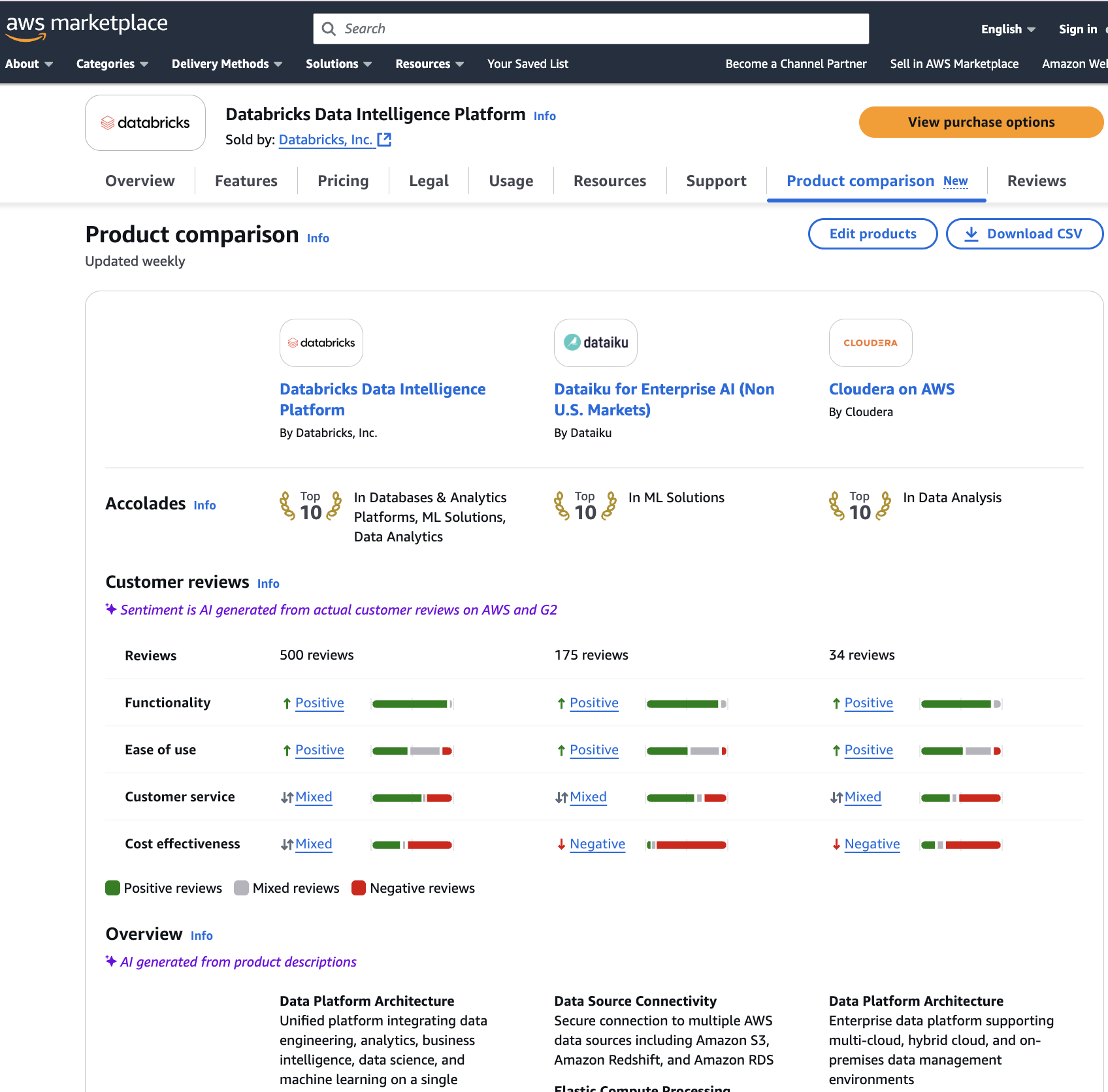 AI-powered product comparison content - powered by G2 - surfaces key customer sentiment and product overviews from over 3 million authentic reviews on G2 and summarizes them in on your AWS Marketplace listing for easy side-by-side product comparisons.