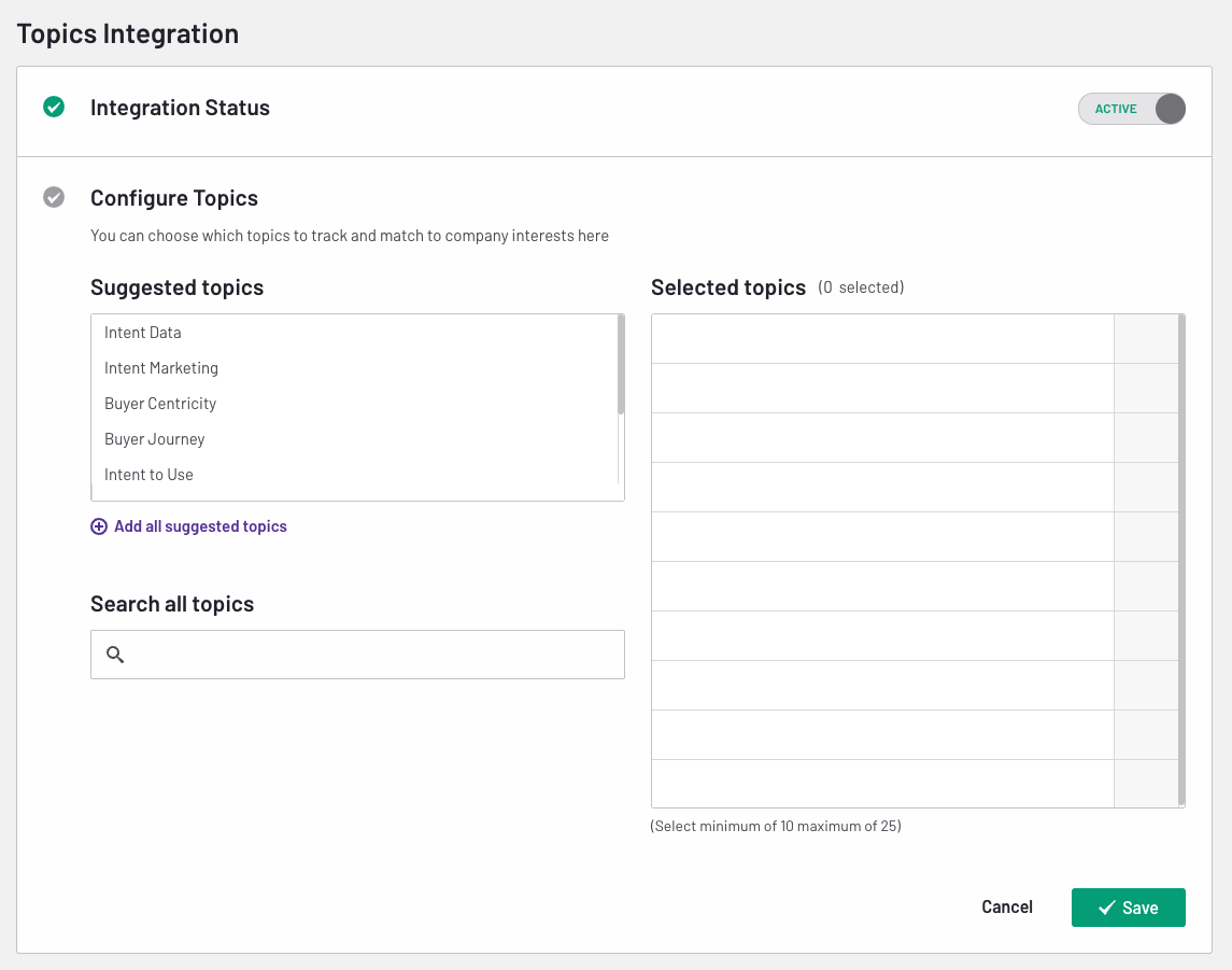 - Select up to 25 topics from Bombora’s B2B topic list that are relevant to your business, products, and competitors.Â