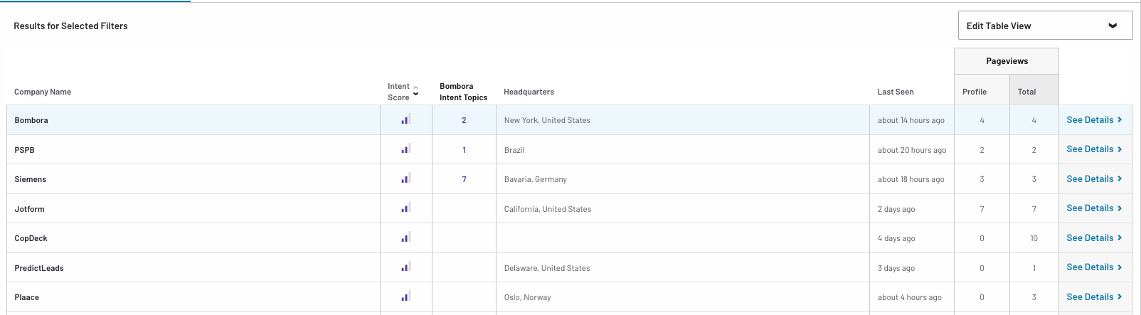 - Directly in the my.G2 Buyer Intent dashboard, view accounts showing intent on both Bombora and G2.com.