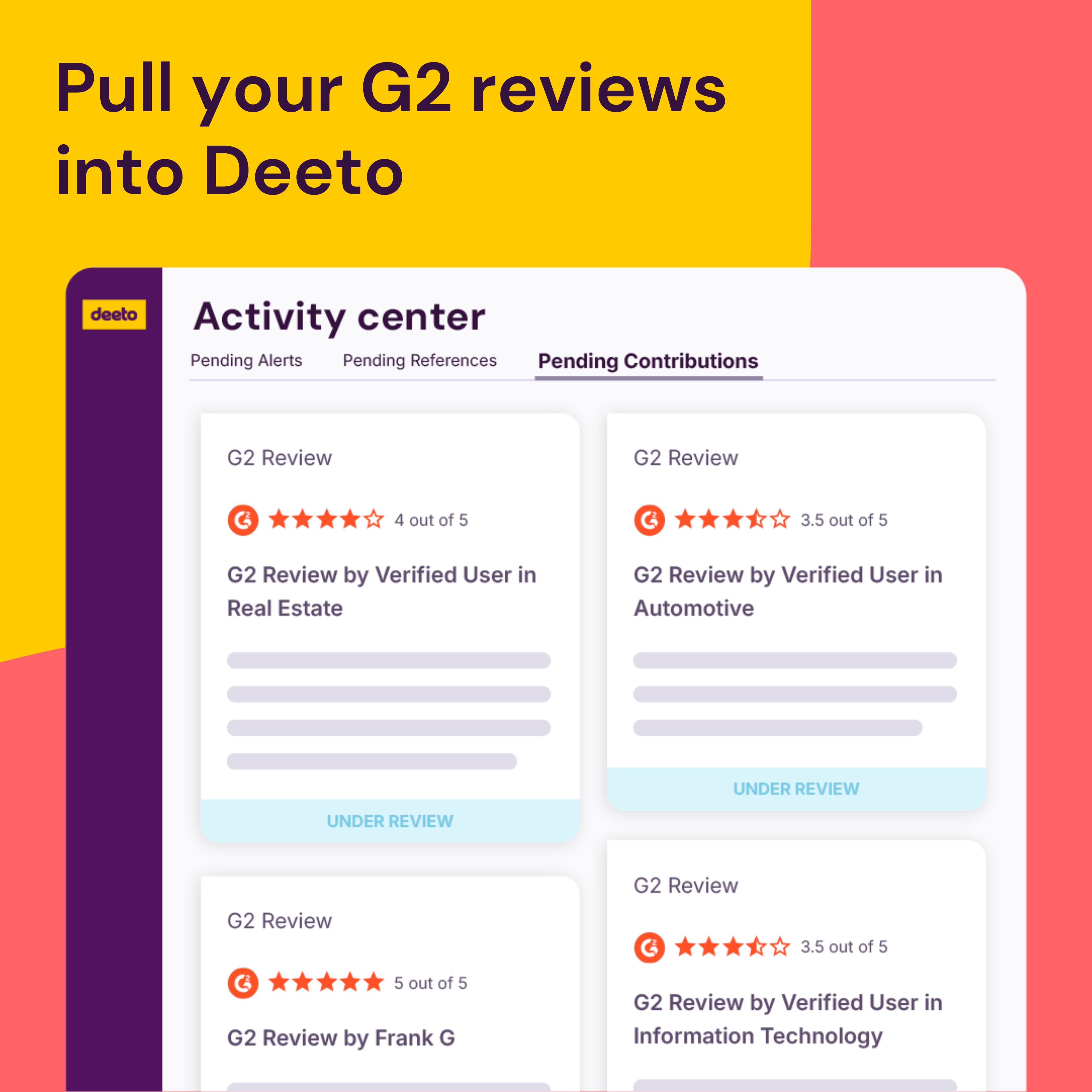 Talk to a rep today and learn more about the benefits of G2 Reviews in Deeto.