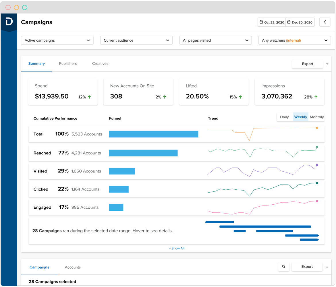 - Based on your ICP, custom audiences of these accounts + contacts dynamically populate and bucket accounts into their appropriate Journey Stages.