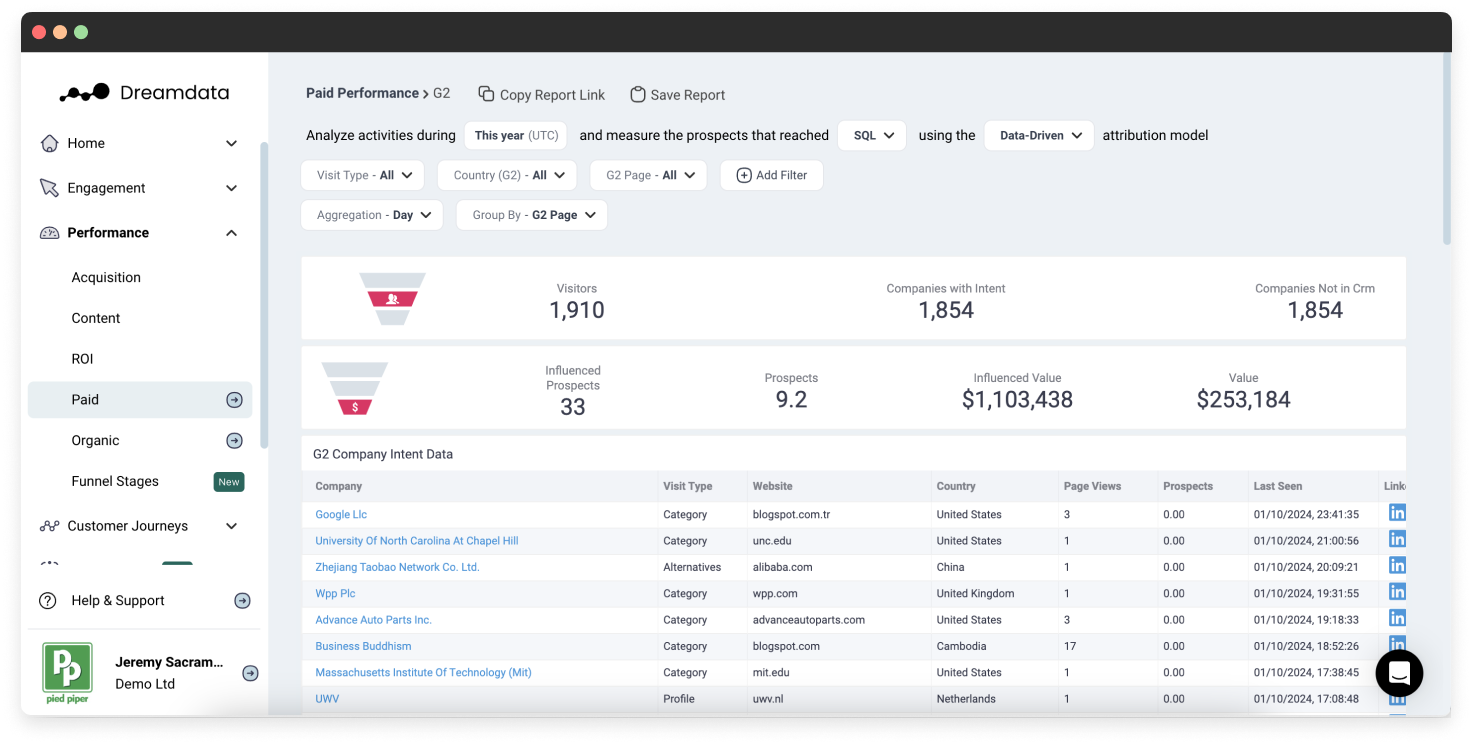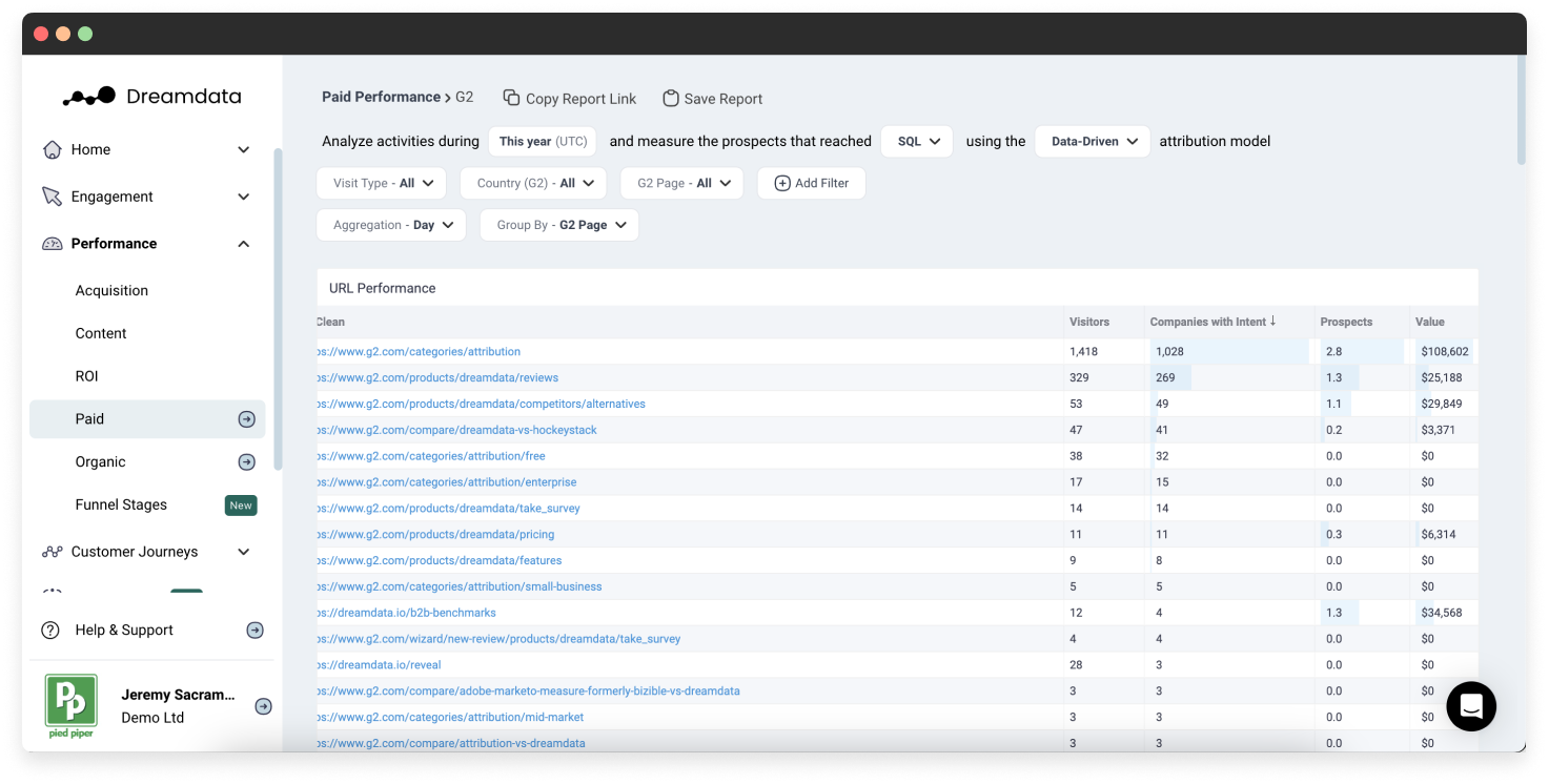 - Connect G2 Buyer Intent signals to opportunity, conversion, and revenue data with Dreamdata’s multi-touch attribution