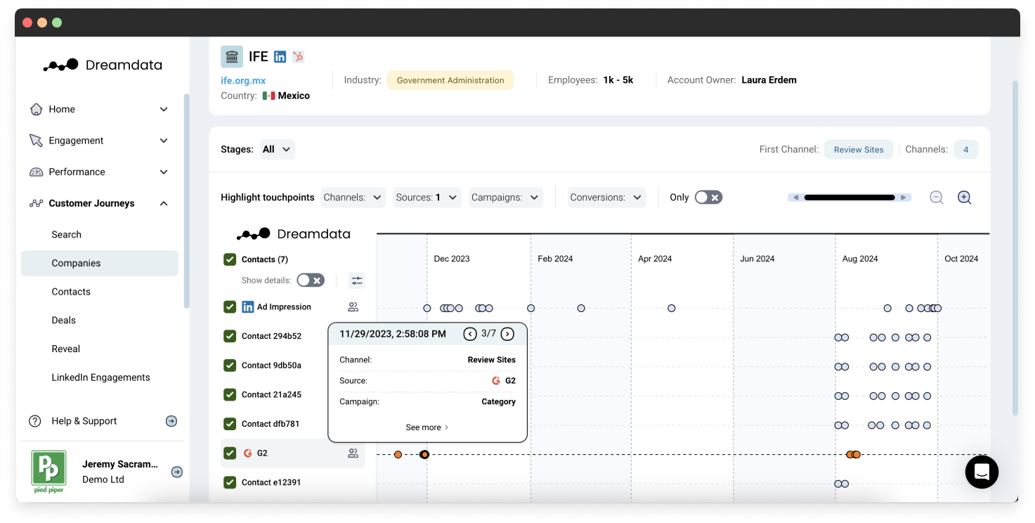 - Visualize every G2 touchpoint in an account's journey with Dreamdata’s Customer Journeys timeline.