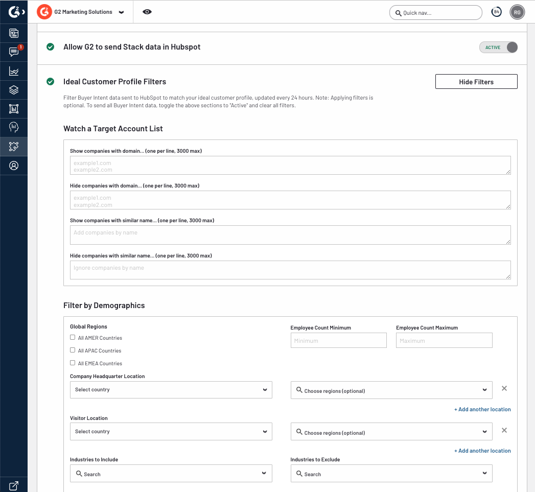 - Select Ideal Customer Profile filters to align the companies sent from G2 to your preferred account characteristics.