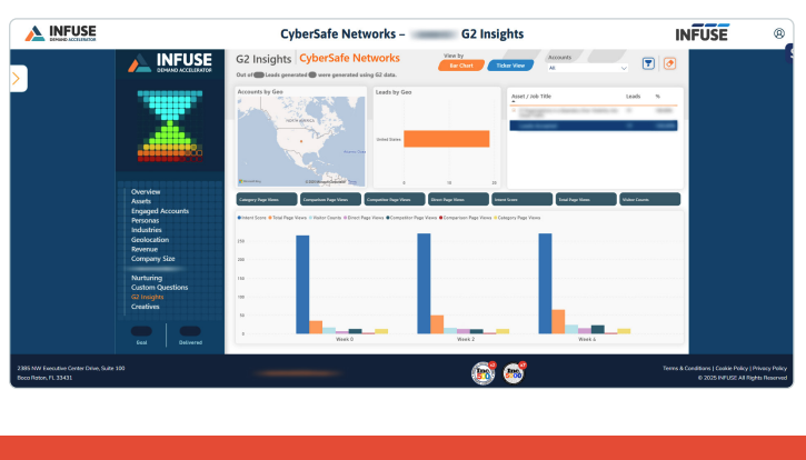 The INFUSE Demand Accelerator platform shows holistic and account level demand intelligence and engagement insights. The combined INFUSE and G2 data gives deeper insight into your target accounts and maximizes campaign outcomes for stronger pipeline impact.