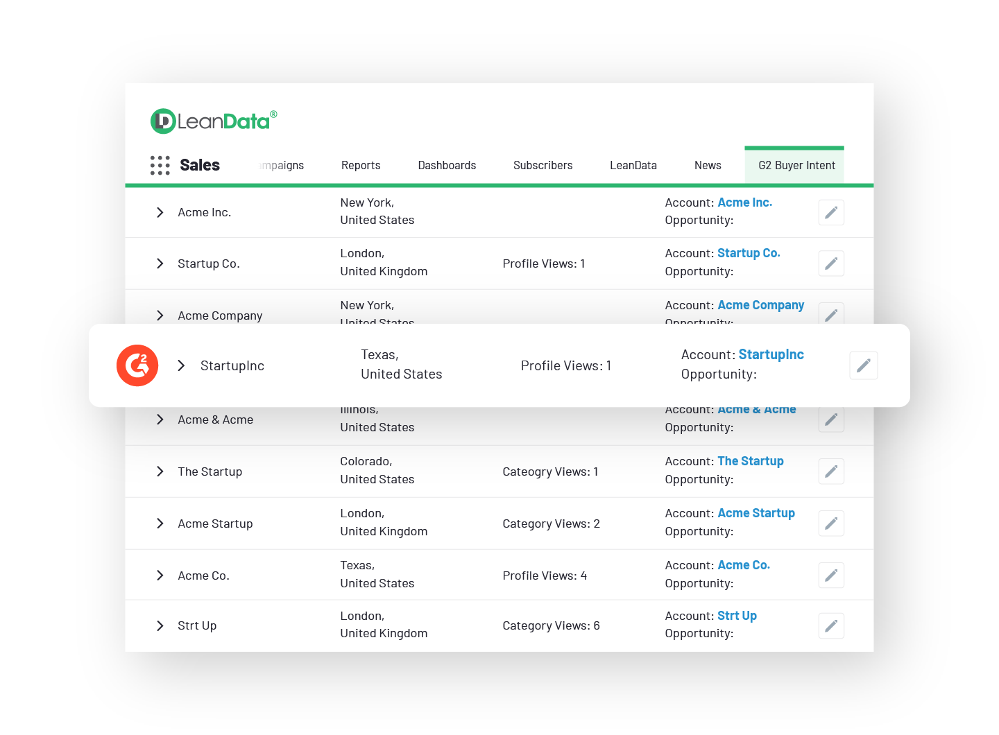 - LeanData will automatically match G2 Buyer Intent accounts with the corresponding, existing accounts in Salesforce – in seconds.