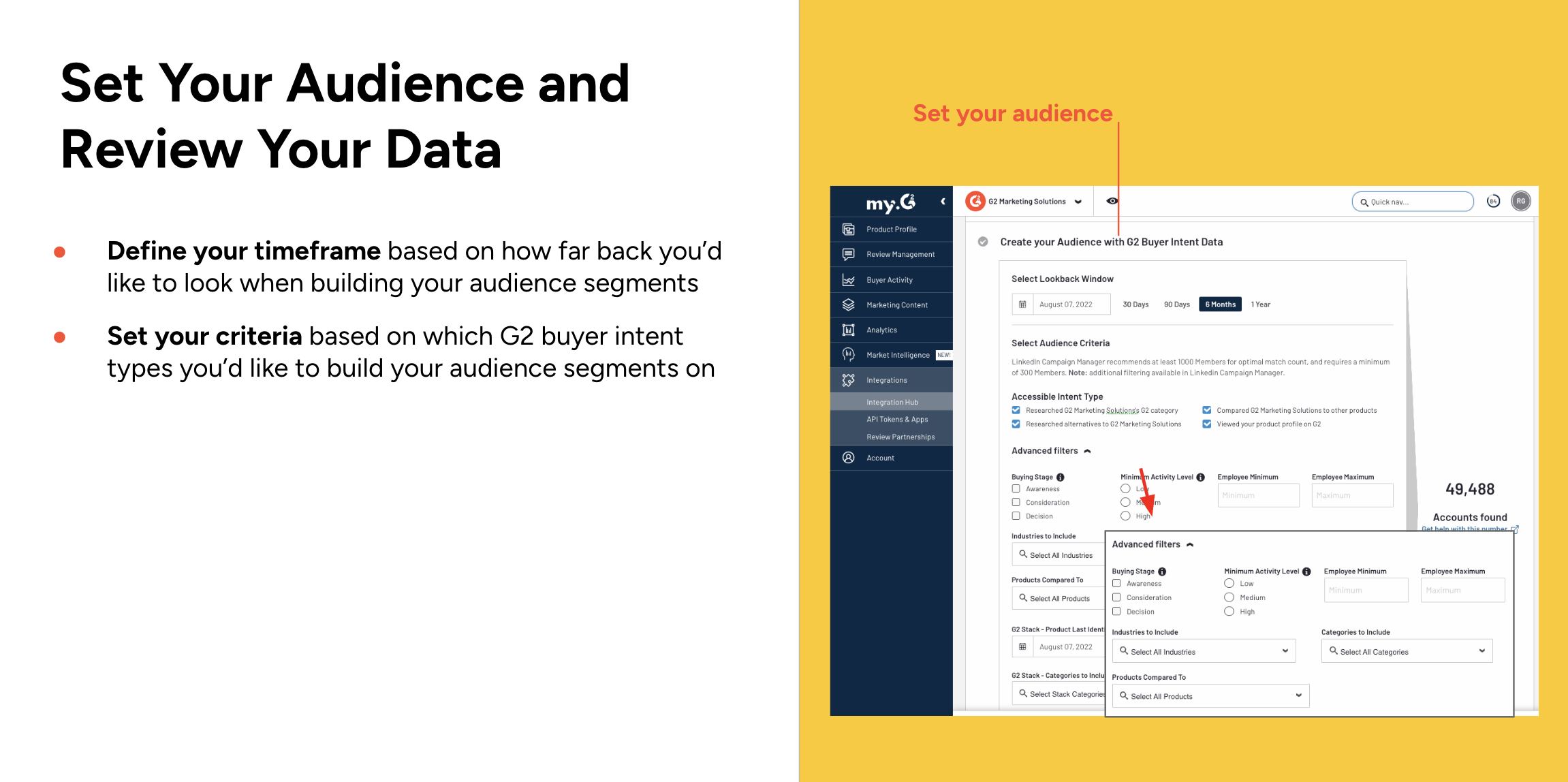 - Create an audience with G2 Buyer Intent Data by focusing on the criteria and timelines that matter most to your business.