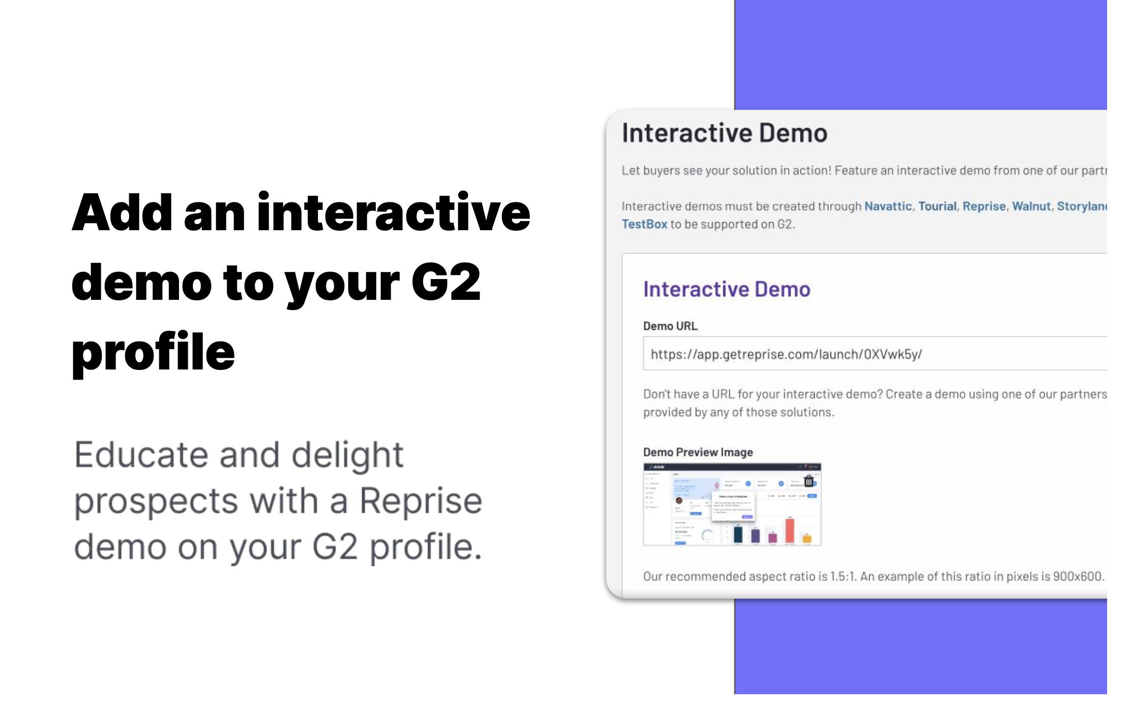 - Paste the tour URL to Product Profile > Interactive Demo in my.G2.Â