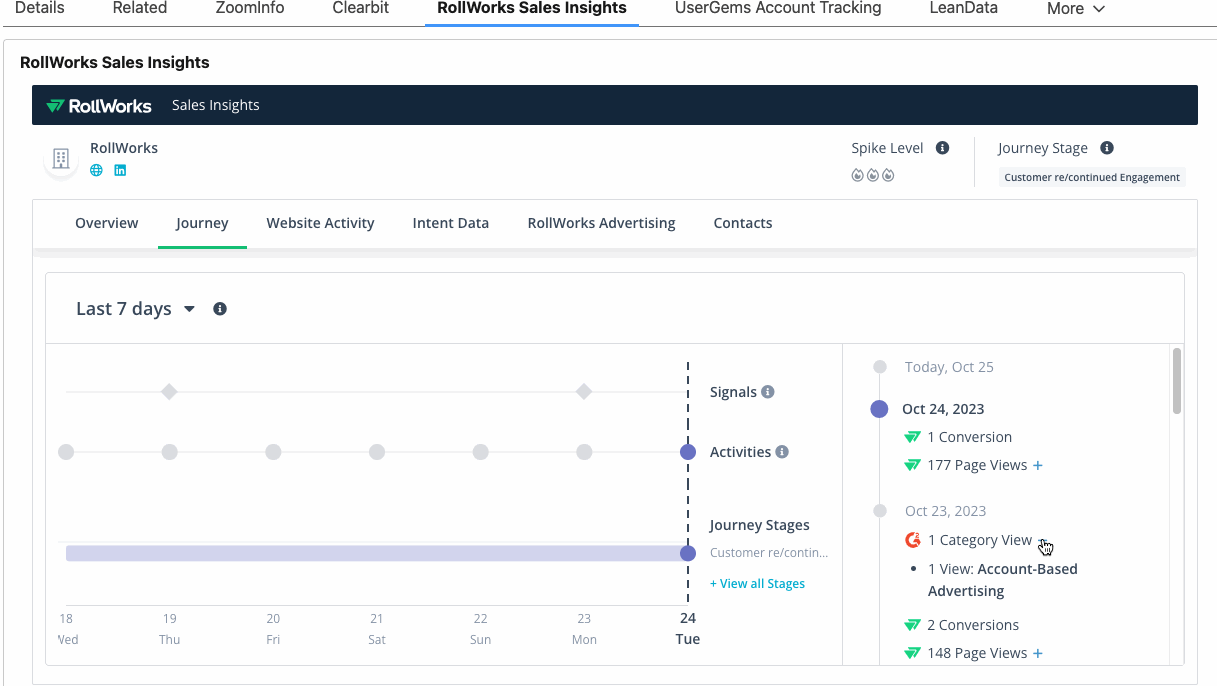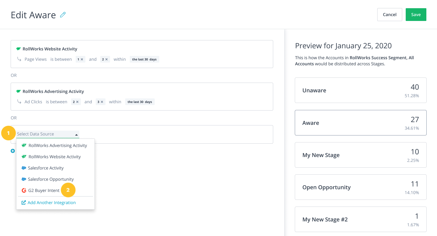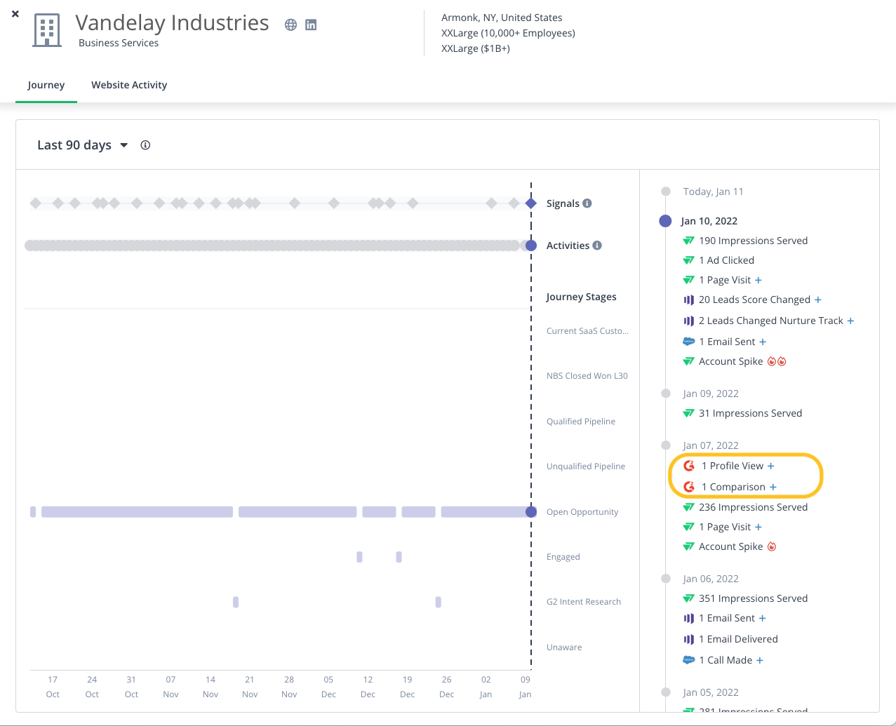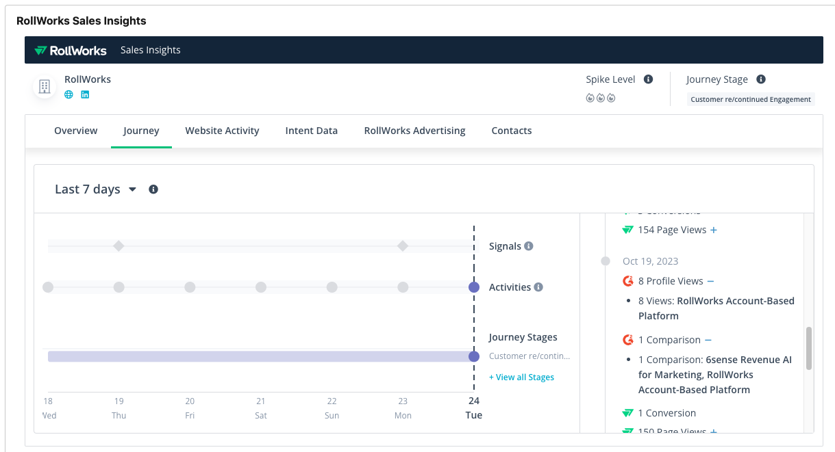 - High-intent accounts bucket into their appropriate RollWorks Journey Stages based on their research behaviors on G2.com.Â