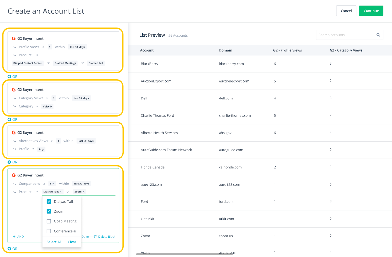 Timing is everything. G2 Buyer Intent surfaces accounts actively researching your Profile, Comparisons, Competitors, and Categories, so you can focus your dollars on high-intent accounts and watch ROAS grow.Â