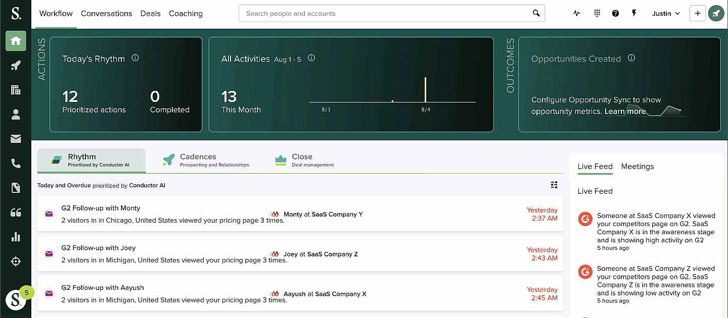G2 Buyer Intent + Salesloft removes the guesswork from sales workflows. It uses buyer behavior and purchase intent signals to recommend the next best action for account engagement. G2 powers Salesloft Rhythm’s AI-driven suggestions at every touchpoint in the sales process so you can capitalize on high priority revenue opportunities.
