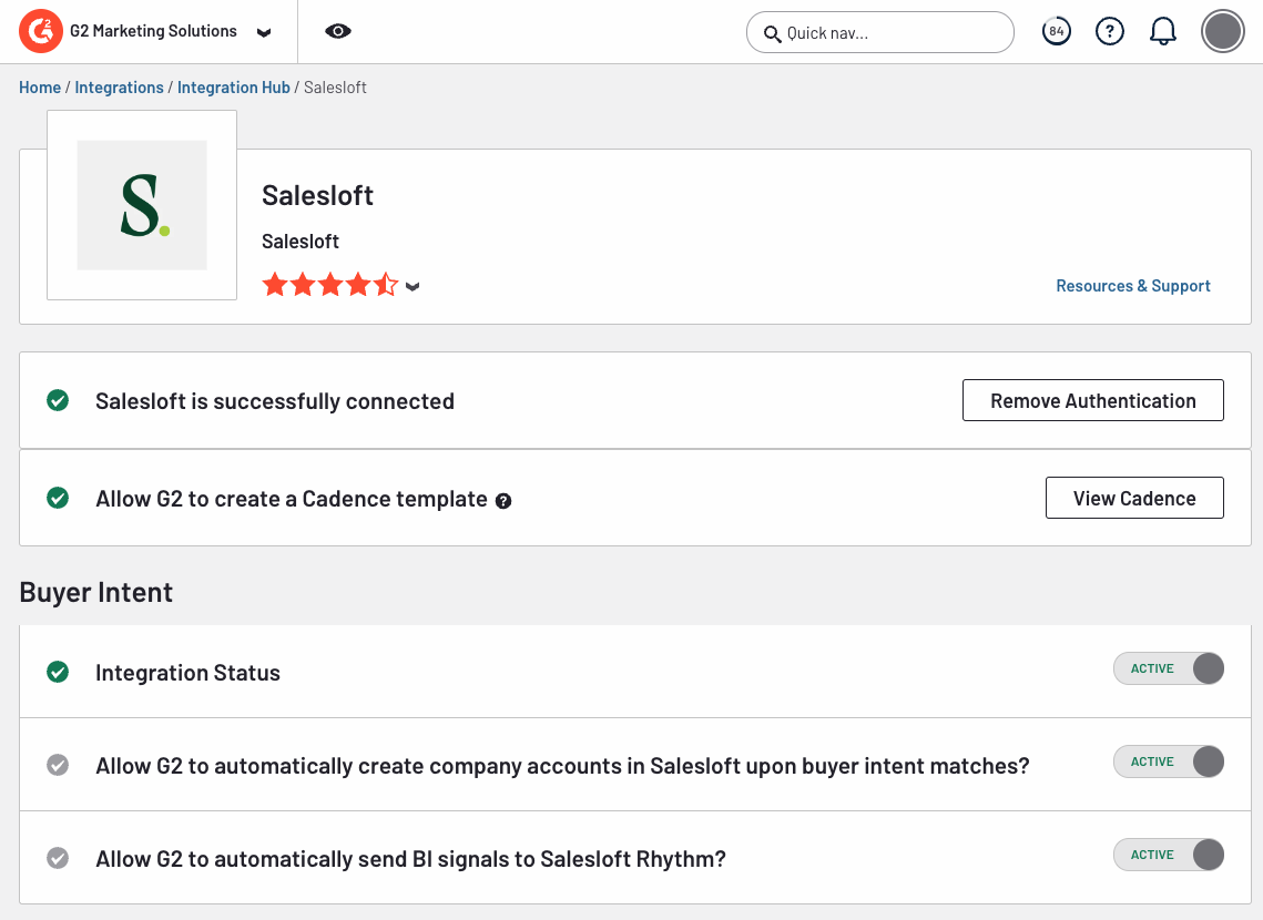 - G2 Buyer Intent data, including Profile views, Product Comparisons, and Alternative/Competitor views are surfaced in Salesloft.