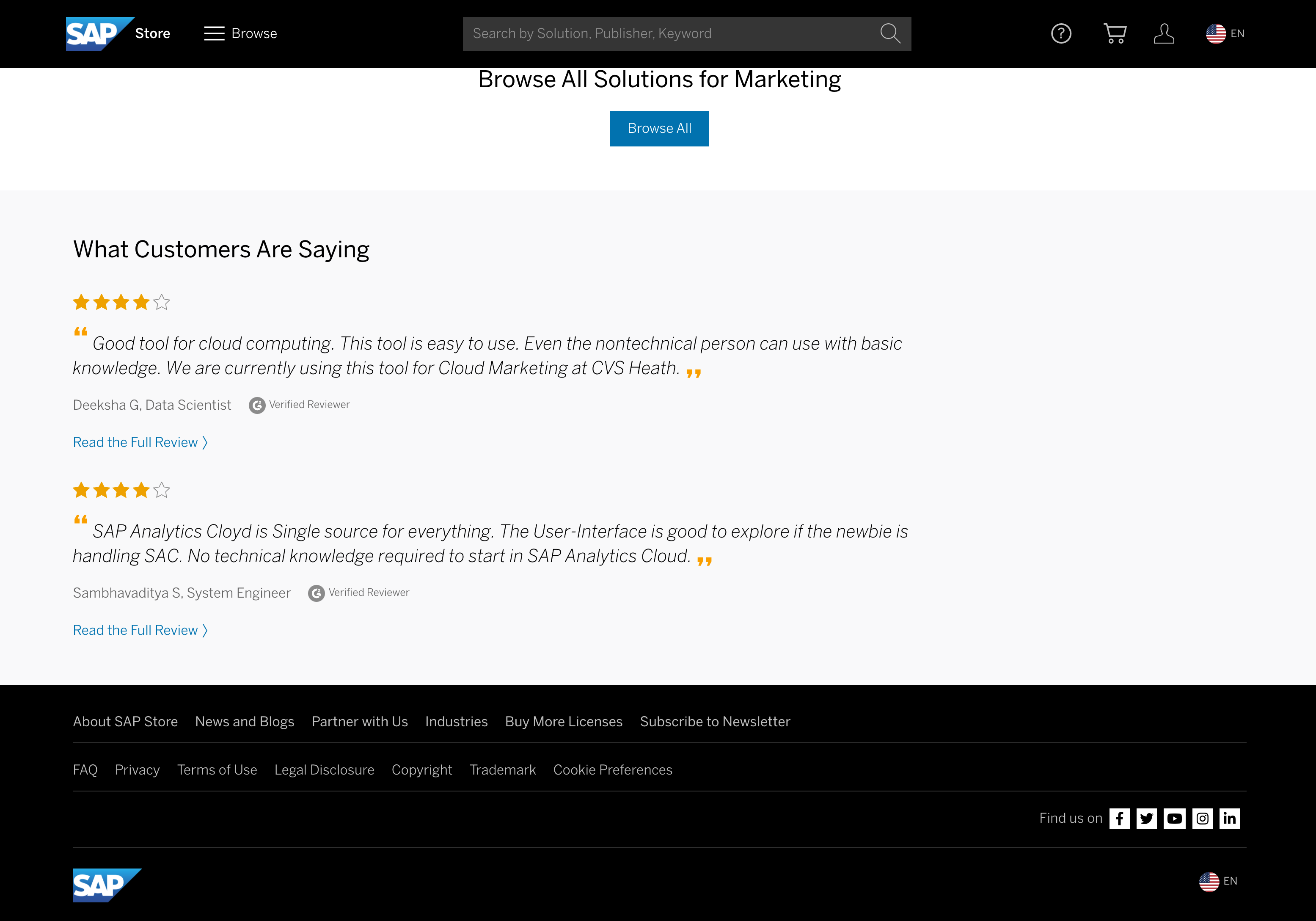 SAP Store is the online marketplace where customers around the world can discover, try, buy, and renew solutions from SAP and its trusted partners. Available in more than 200 countries and territories globally, the Store provides real-time access to innovative solutions to inform intelligent enterprises and digitally transform business.