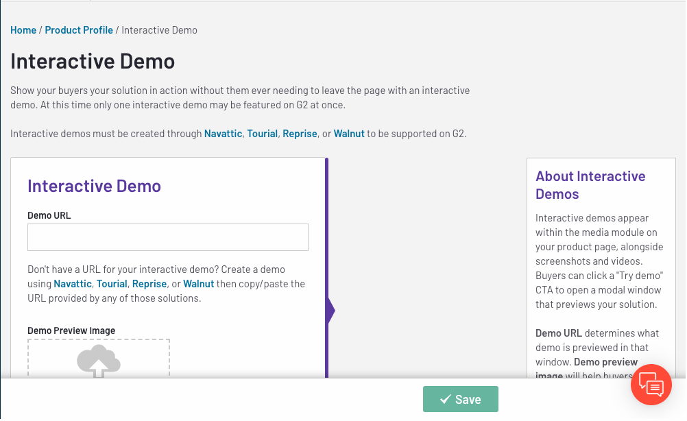 - Paste the tour URL to Product Profile > Interactive Demo in my.G2.Â