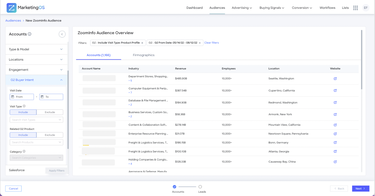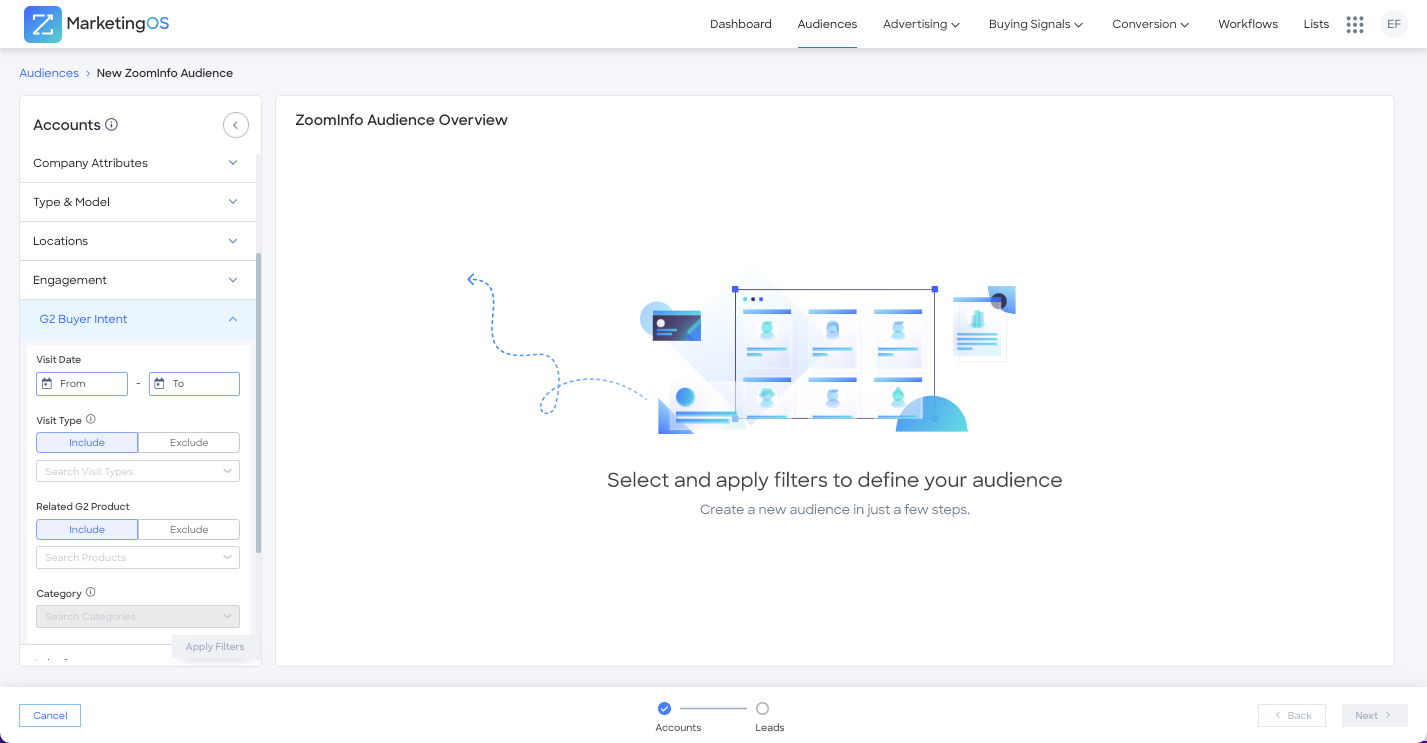- Search for accounts and contacts with G2 Buyer Intent. Layer additional ZoomInfo data attributes to fine-tune audience specifications and fit your ideal customer profile.Â