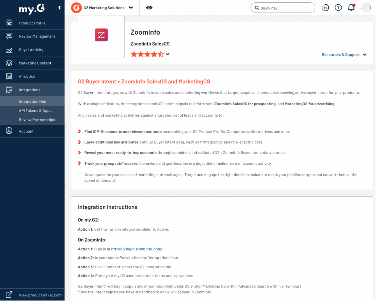 To activate this integration, log in to my.G2Â > Integrations Hub > ZoomInfo to get started.